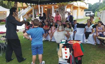 Javier hace de mago despistado, que no oye bien, se olvida de los nombres de los niños, se equivoca con las edades, y las bromas crean ese toque de humor, que junto con la magia hace que el espectáculo sea muy especial. El abanico que estábamos usando se rompe, las tijeras se sueltan las dos hojas, la barita se rompe en trocitos, la cuerda es cortada por el niño con sus dedos, etc. Ellos hacen la magia y sucede en sus propias manos sin saber como.